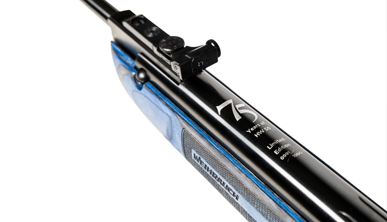 Weihrauchs erstes Luftgewehr, das Modell HW 50 V feiert dieses Jahr seinen 75. Geburtstag. Aus diesem Anlass wurde eine limitierte Sonderserie des HW 50 S über 1.000 Stück aufgelegt. Das Modell kommt mit einem blau-grauen Schichtholzschaft mit spezieller Punzierung und Laserbeschriftung auf den Markt. Die Punzierung am Pistolengriff und das Design des Vorderschaftes sind der Ausführung des ersten Modells nachempfunden. Auf der Unterseite des Pistolengriffs befindet sich zudem eine Lasergravur. Das System ist mit einer offenen Visierung und der Standard-Lauflänge ausgestattet und mit einer limitierten Lasergravur beschriftet.